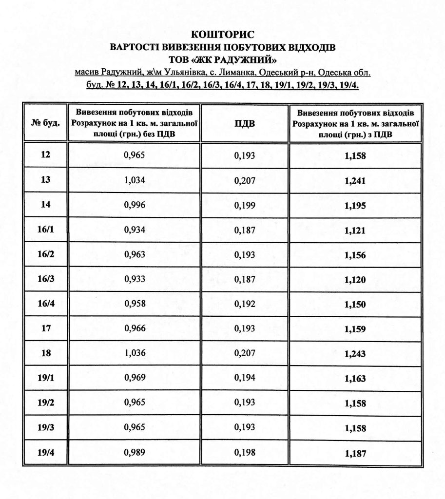 ТОВ «ЖК Радужний», у звʼязку з підвищенням вартості послуг з вивезення твердих побутових відходів, подав у Таїровську селищну раду Одеського району Одеської області відповідні супутні документи для коригування та встановлення цін/тарифів на управління побутовими відходами в будинках 12, 13, 14, 16/1, 16/2, 16/3, 16/4, 17, 18, 19/1, 19/2, 19/3, 19/4, масиву Радужний, ж/м Ульянівка, с. Лиманка, Одеського району, Одеської області.