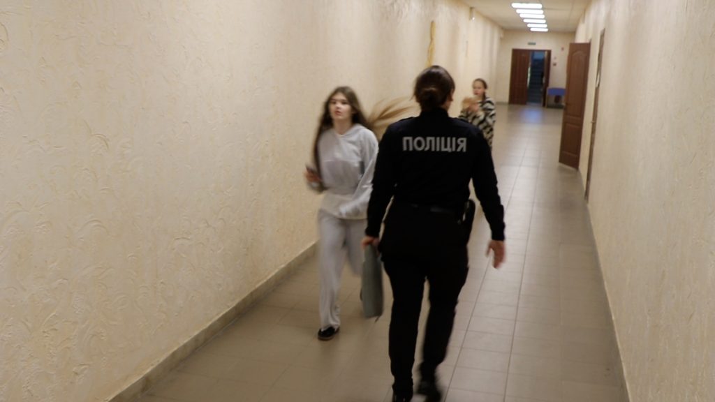 Продовжуємо спілкування про шкільні автобуси, проте розмову перериває повітряна тривога. Під наглядом співробітниці поліції та вчителів діти прямують до укриття, ми з Артемом Васильовичем йдемо за ними.