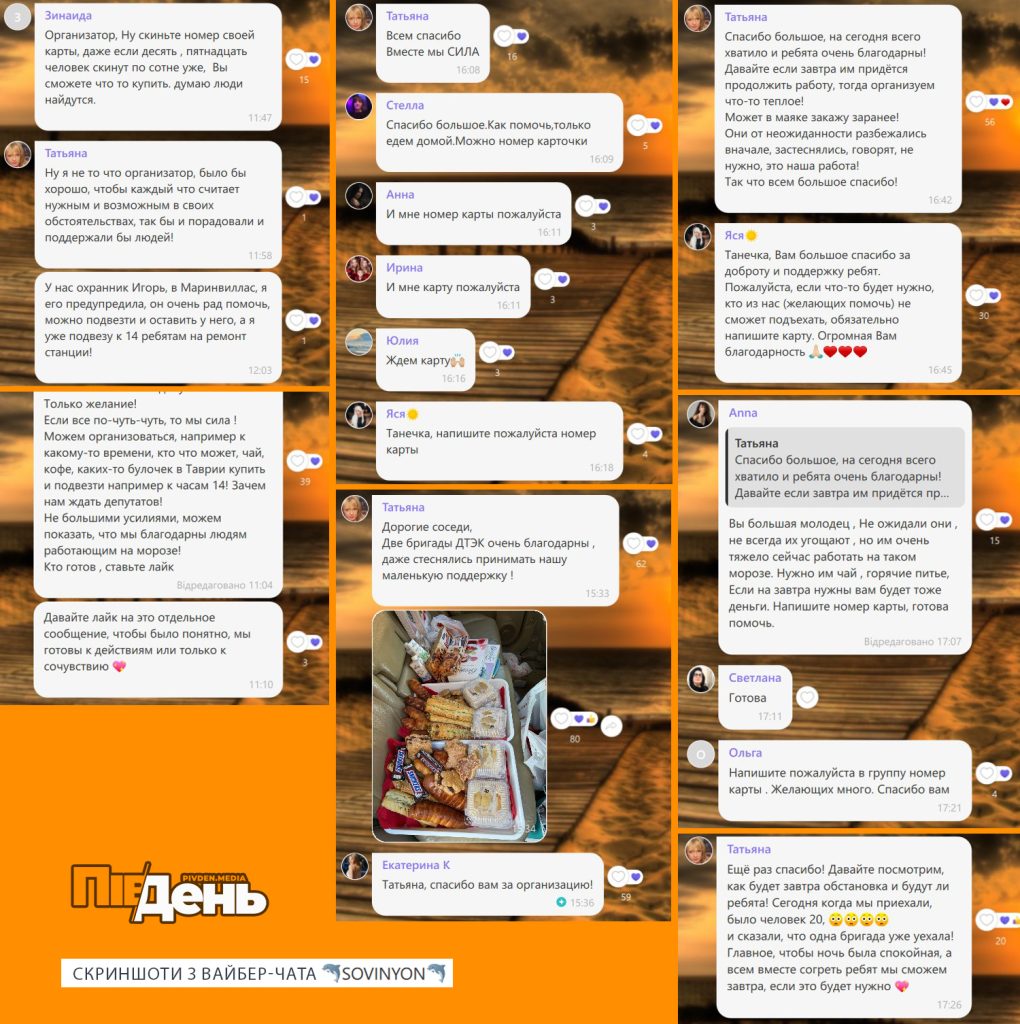Так це й спрацювало. Вже к обіду совіньйонівці принесли на підстанцію все, що назбирали/приготовили/купили. На об’єкті працювало два десятки майстрів. Вони не очікували такої турботи.
